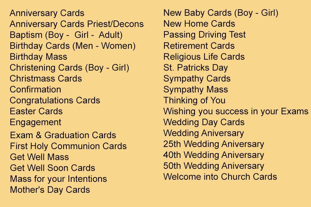 Please note: All items are subject to availability. Any item not available may be ordered specially. If you are travelling from another Parish, we suggest you ring Fr. Julius on 01902 782144 to save a wasted journey.